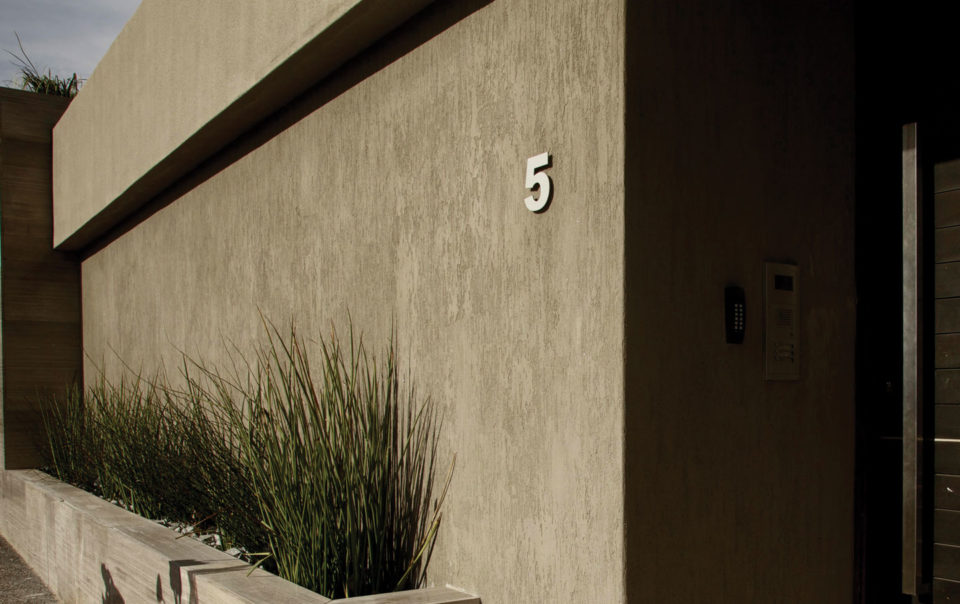 A modern take on exterior paint with our Midas Envirolite Natureplast. Another successful marriage between a rough texture and wood.